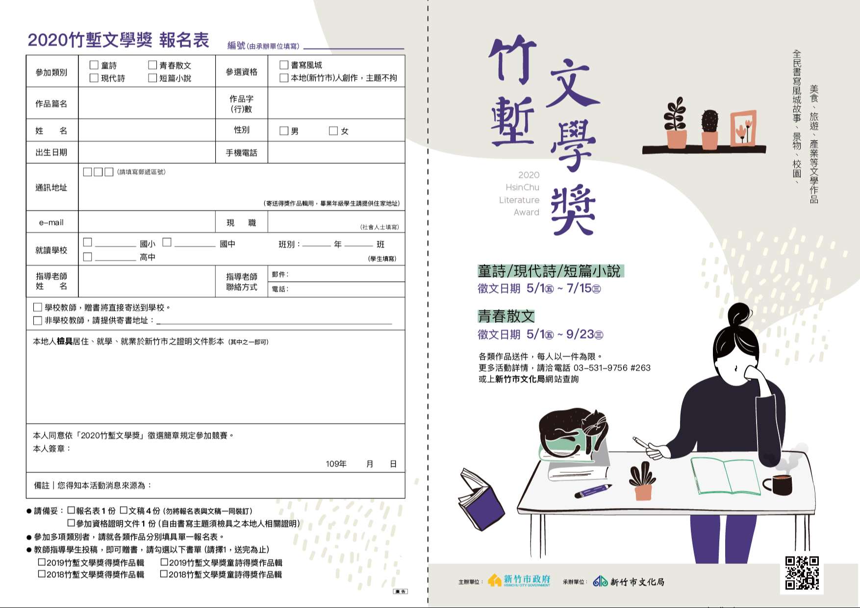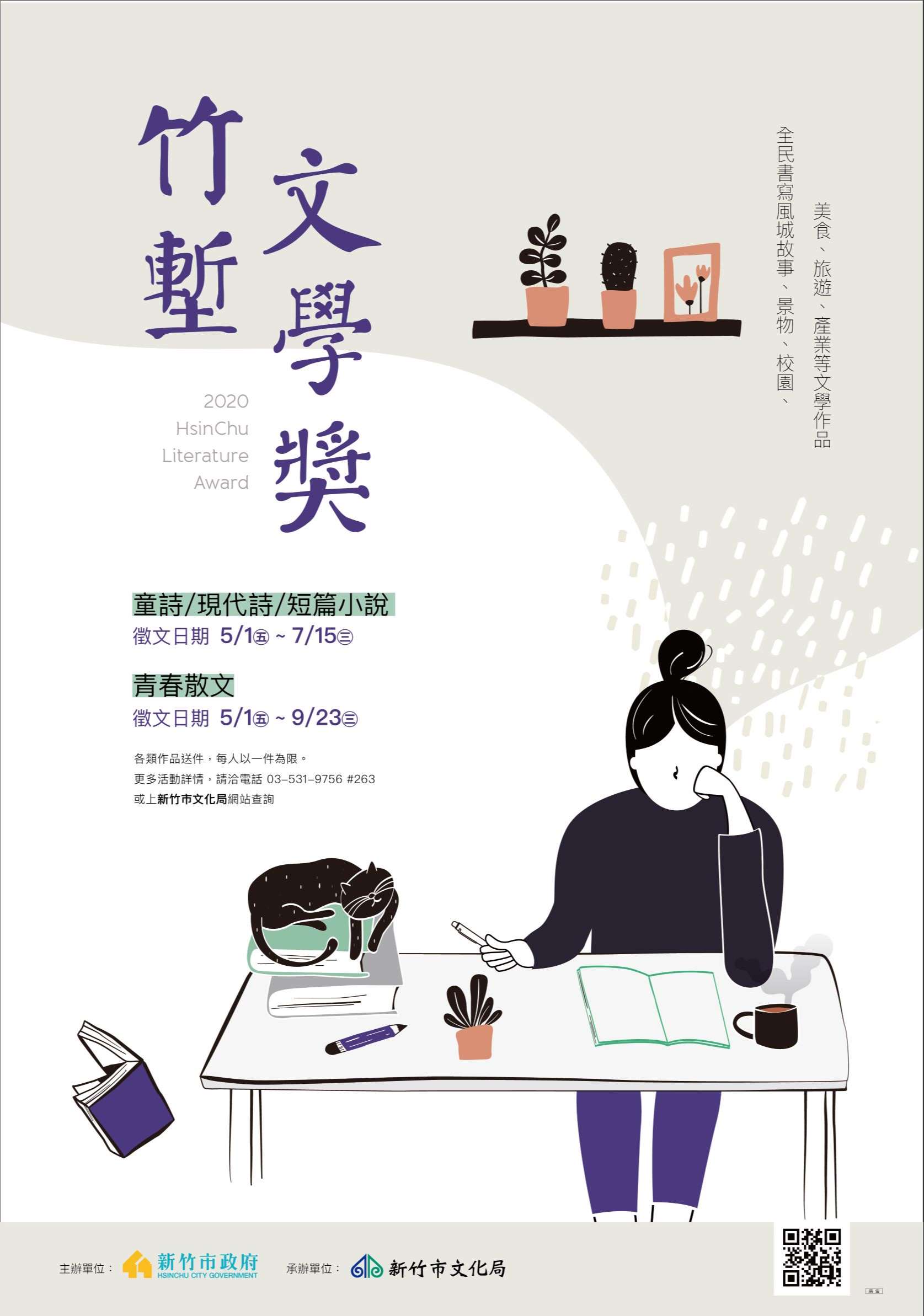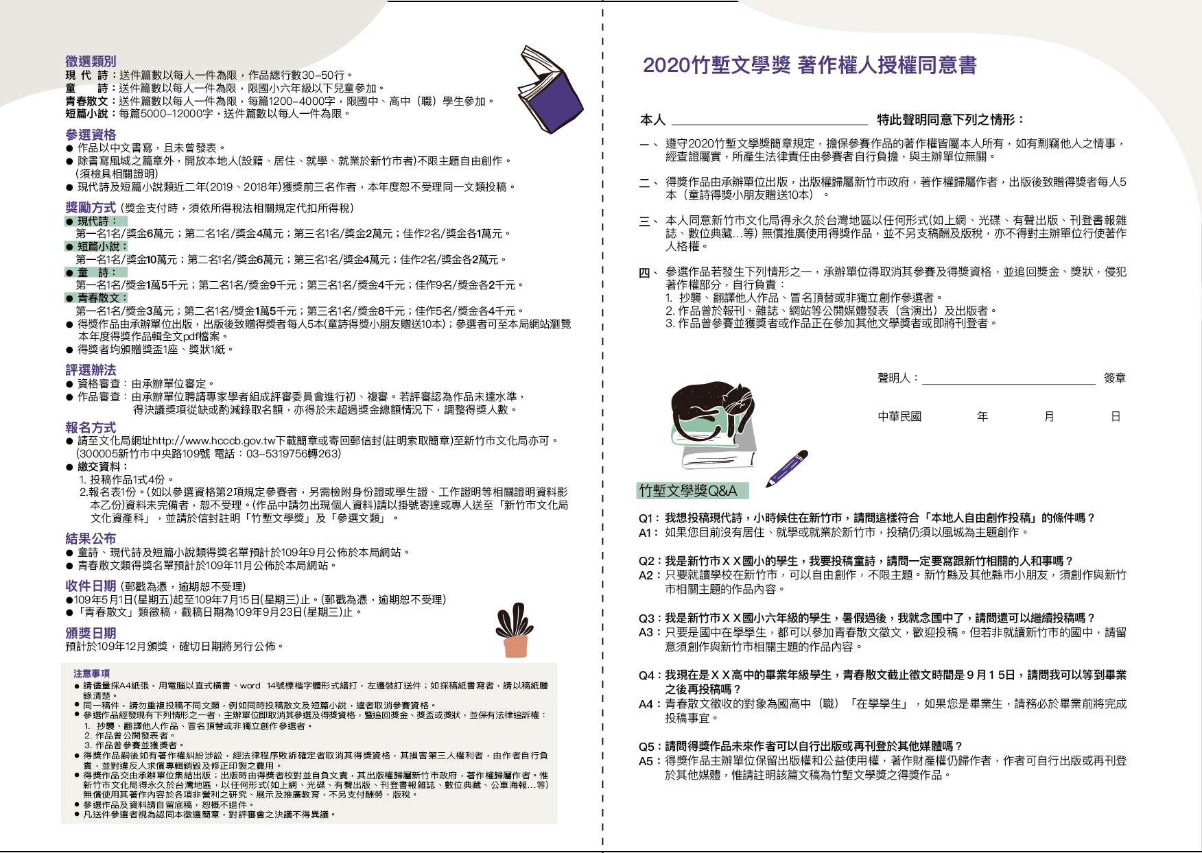 四、活動資訊及簡章請至本局網站:https://culture.hccg.gov.tw/業務項目/竹塹文學獎/公告下載,歡迎下載利用。