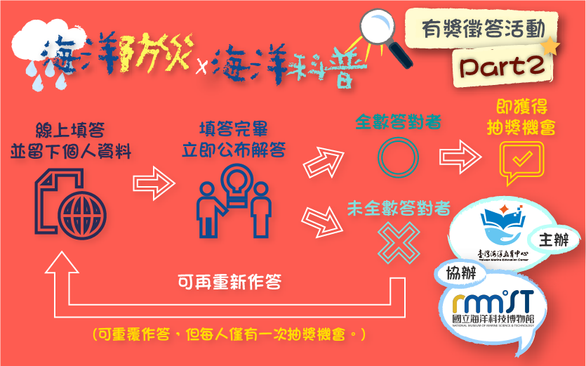 臺灣海洋教育中心為推廣海洋防災與海洋科普,特此於2019年9月辦理線上有獎徵答活動,以促進民眾對海洋的認識;為使海洋防災與海洋科普資源更有效宣傳與利用,故本年擴大辦理「海洋防災與海洋科普有獎徵答活動Part2」,將活動時間延長,歡迎大家共襄盛舉。