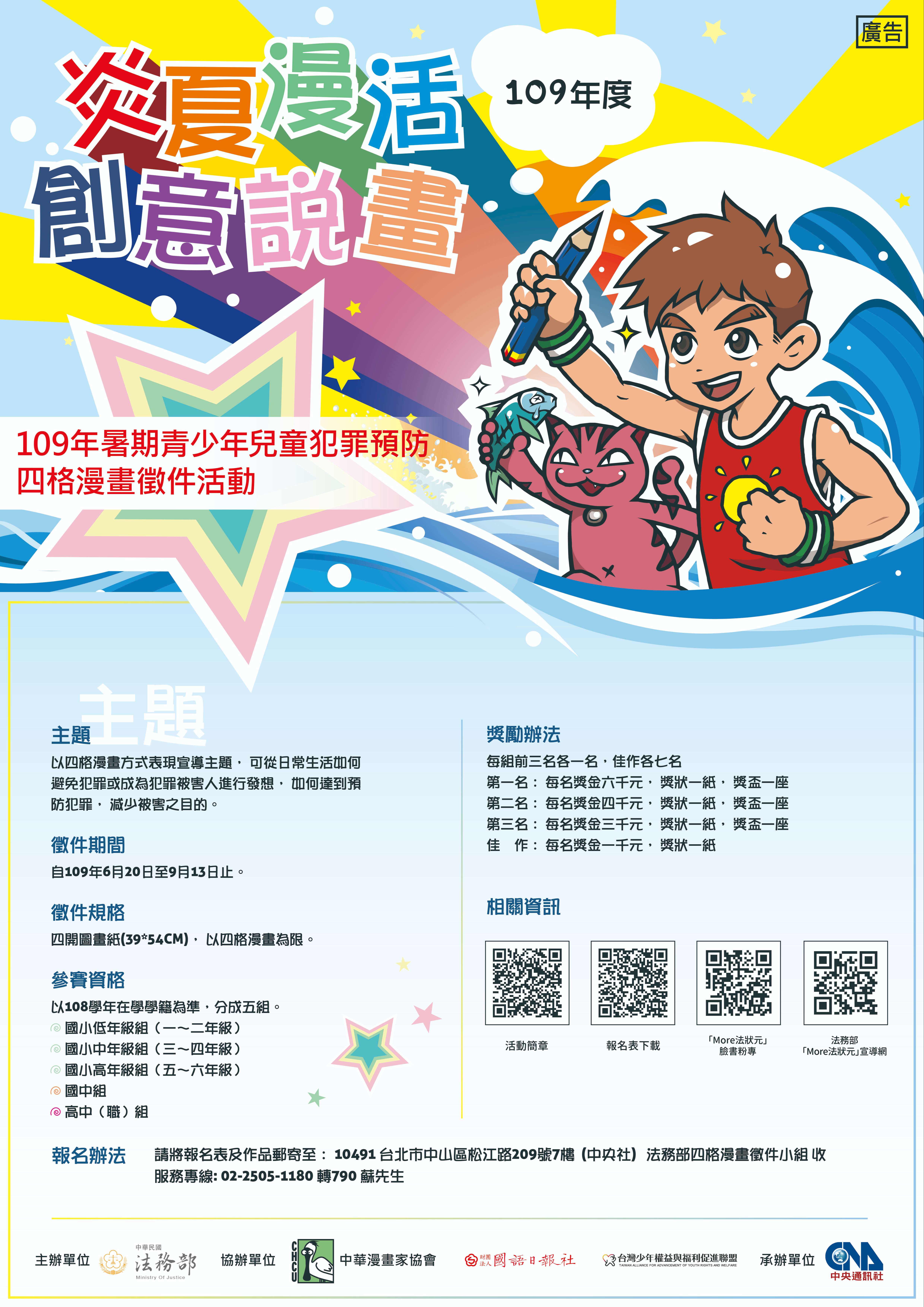 法務部「炎夏『漫』活,創意說『畫』」109年暑期青少年兒童犯罪預防四格漫畫徵件活動之宣傳海報、簡章等資料 詳如附件