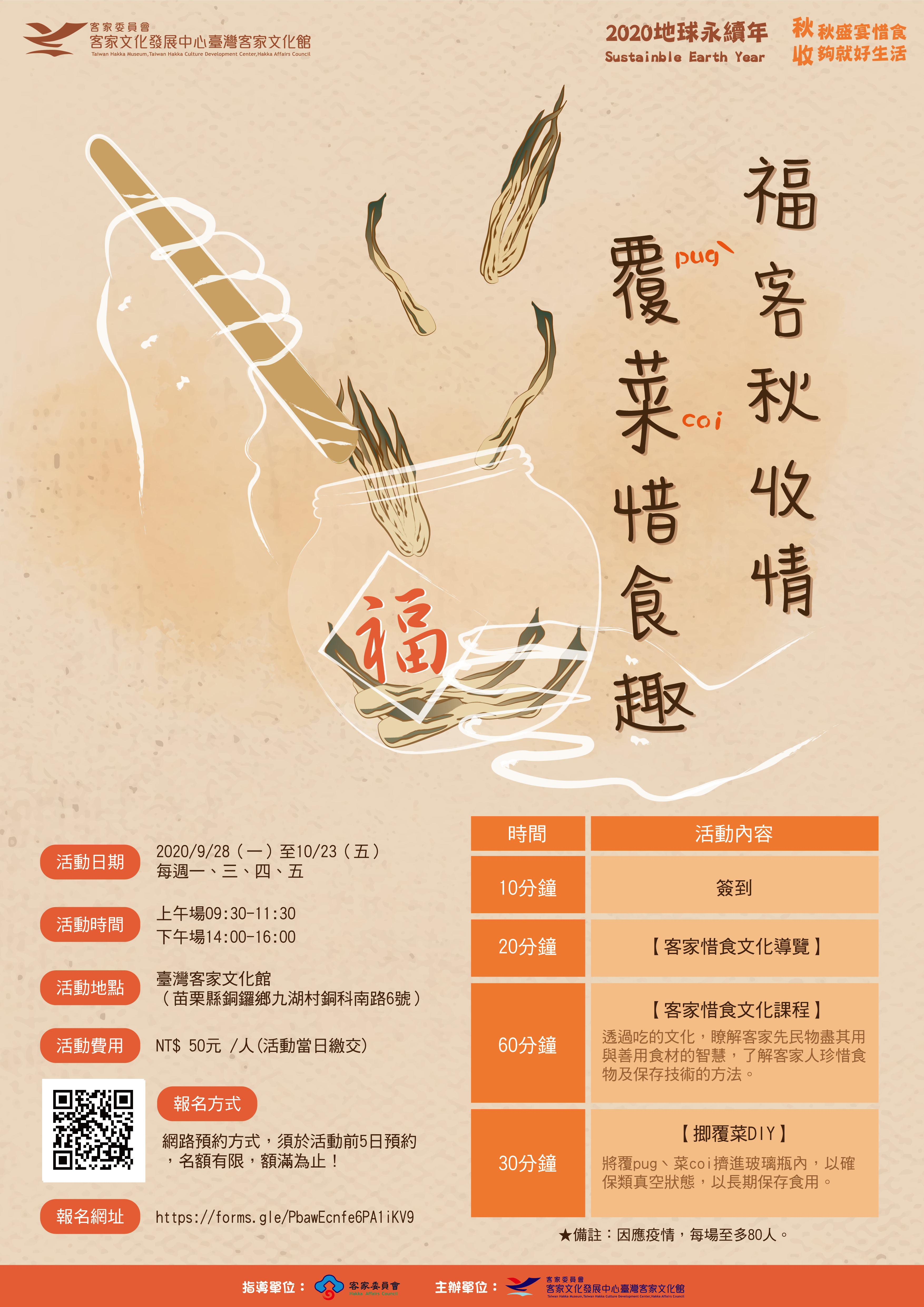 臺灣客家文化館為推廣客家傳統飲食與惜物精神,結合2020地球永續年第3季「秋收-秋盛宴惜食」,於109年9月28日至10月23日辦理「福客秋收情-覆菜惜食趣」活動,歡迎大家踴躍報名參加,詳情請見附件。