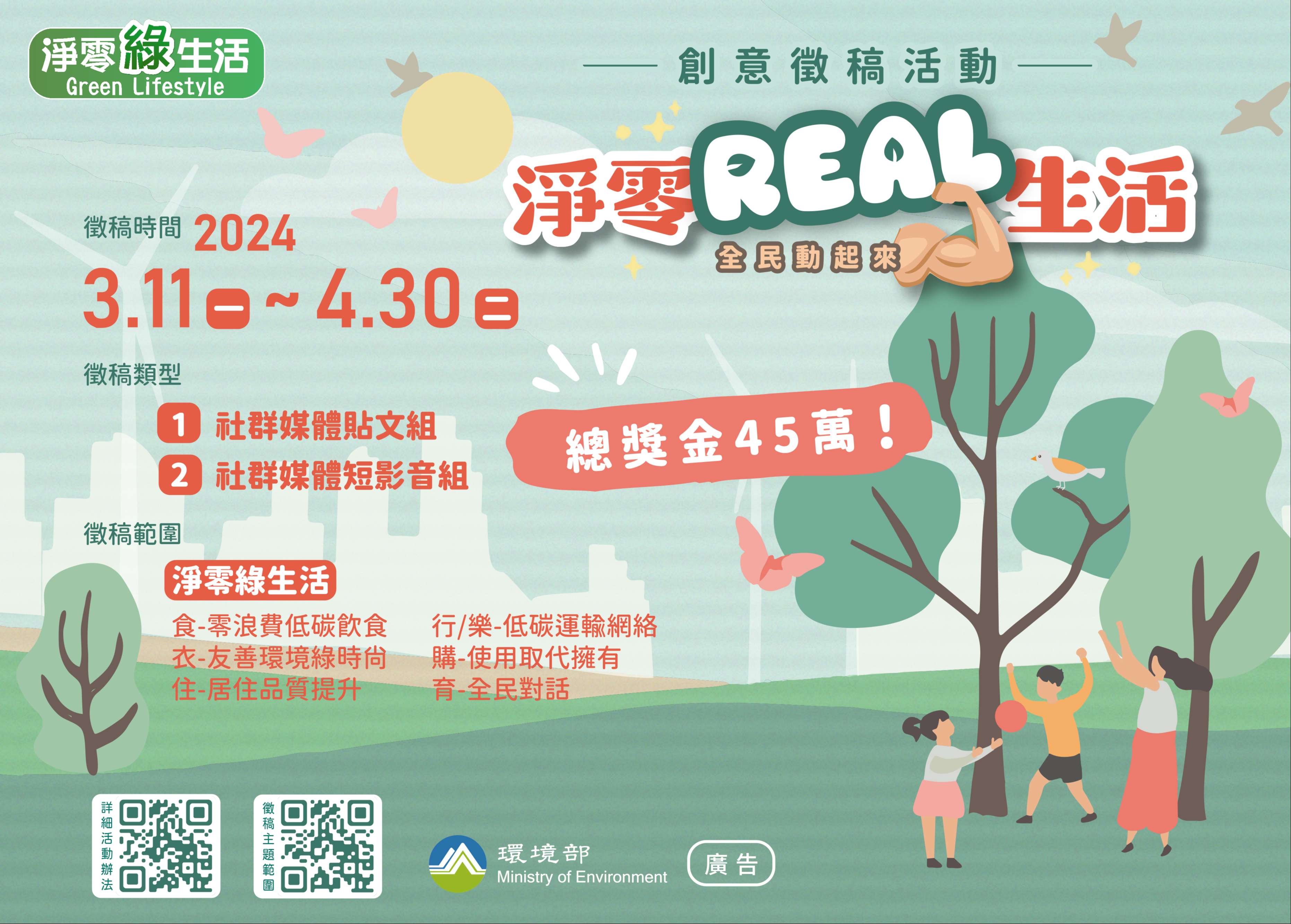 二、 | 旨揭徵稿活動目的旨在為鼓勵民眾從日常生活中落實淨零綠生活轉型,以簡單明瞭又易於實踐的方式,結合現今社群媒體分享,擴大宣導層面,深入民眾生活與日常,以響應淨零綠生活;「淨零Real生活」徵稿主題包括「食-零浪費低碳飲食」、「衣-友善環境綠時尚」、「住-居住品質提升」、「行/樂-低碳運輸網絡」、「購-使用取代擁有」及「育-全民對話」六大面向。 |