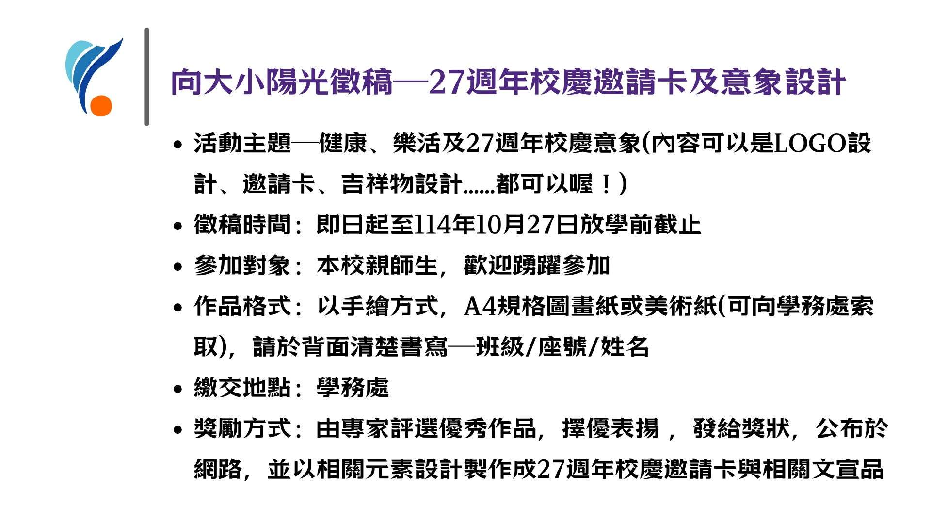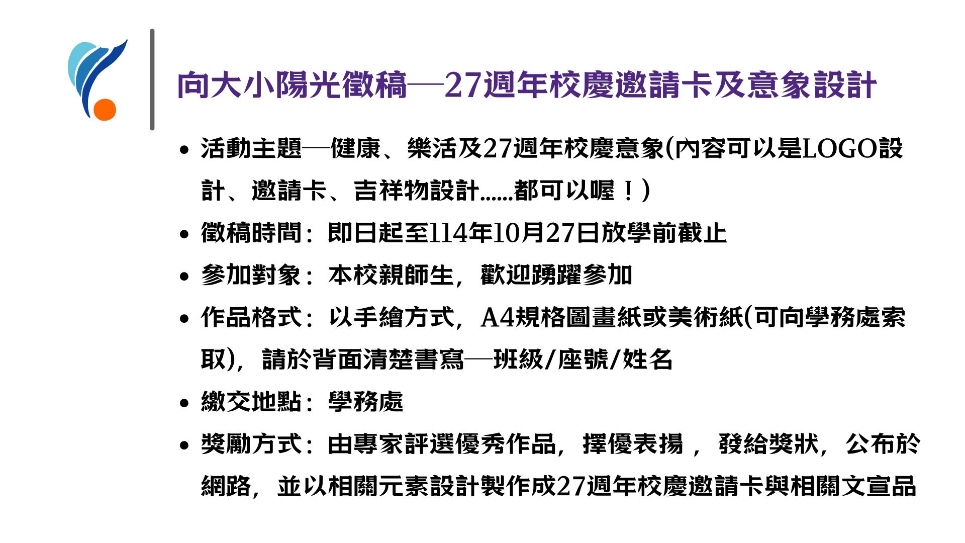 陽光校慶一向是運動會和博覽會形式交替,今年第27屆校慶是運動會形式。我們將以運動、健康、樂活為主軸,展現孩子們自發學習、團隊互動與社會共好的學習成果,迎接陽光豐收季節的到來。設計主題─健康、樂活及27週年校慶意象(內容可以是LOGO設計、邀請卡、吉祥物設計......都可以喔!)