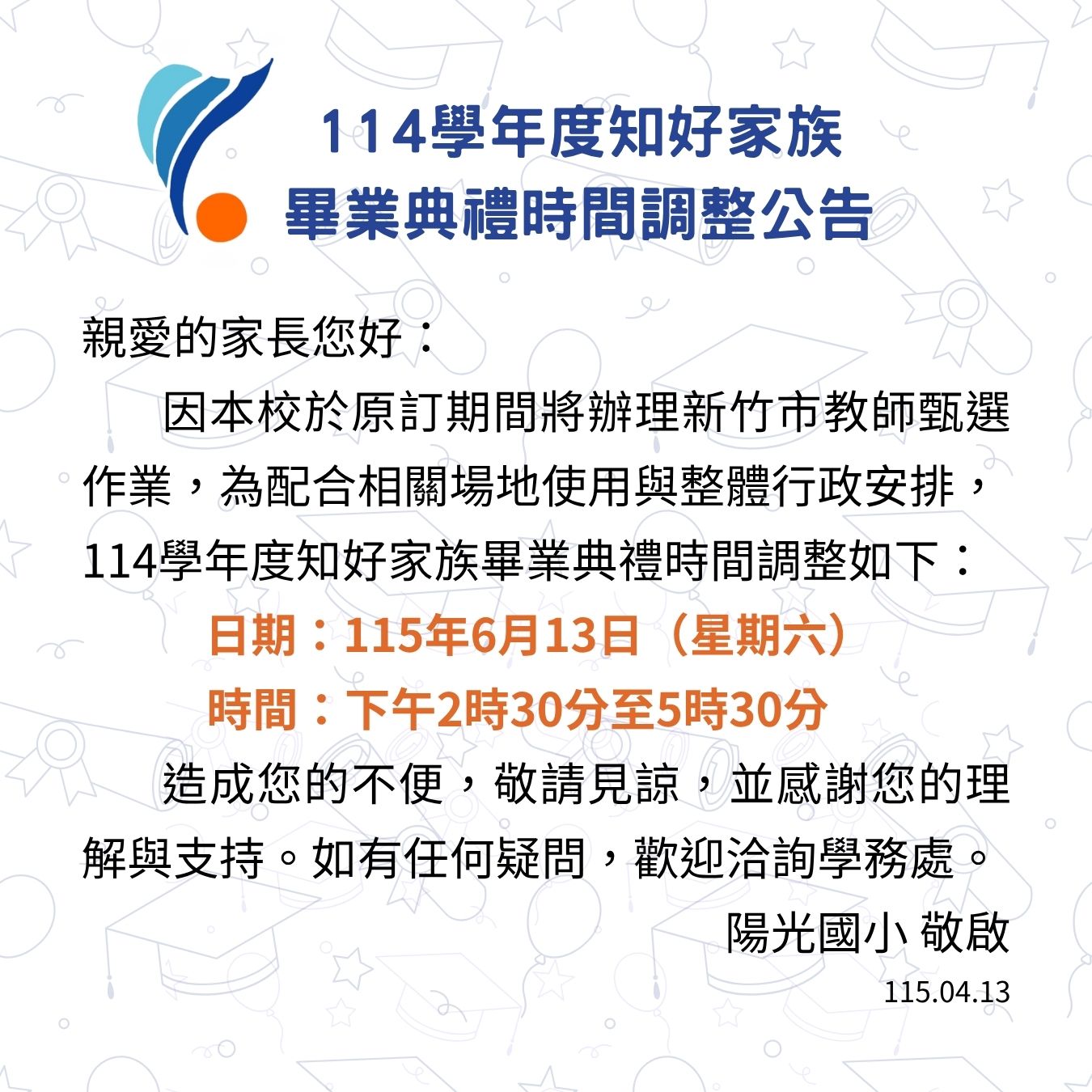【114學年度知好家族畢業典禮時間調整公告】