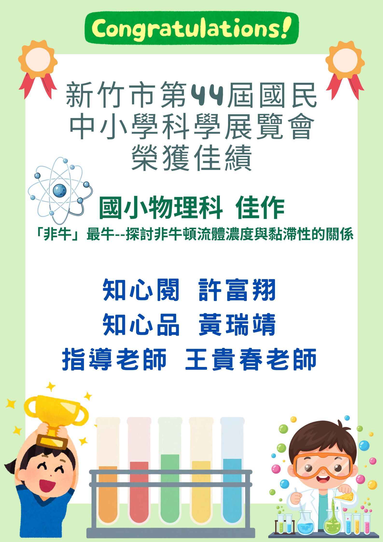 恭喜知心閱班 許富翔及知心品班 黃瑞靖以『非牛』最牛--探討非牛頓流體濃度與黏滯性的關係為題,