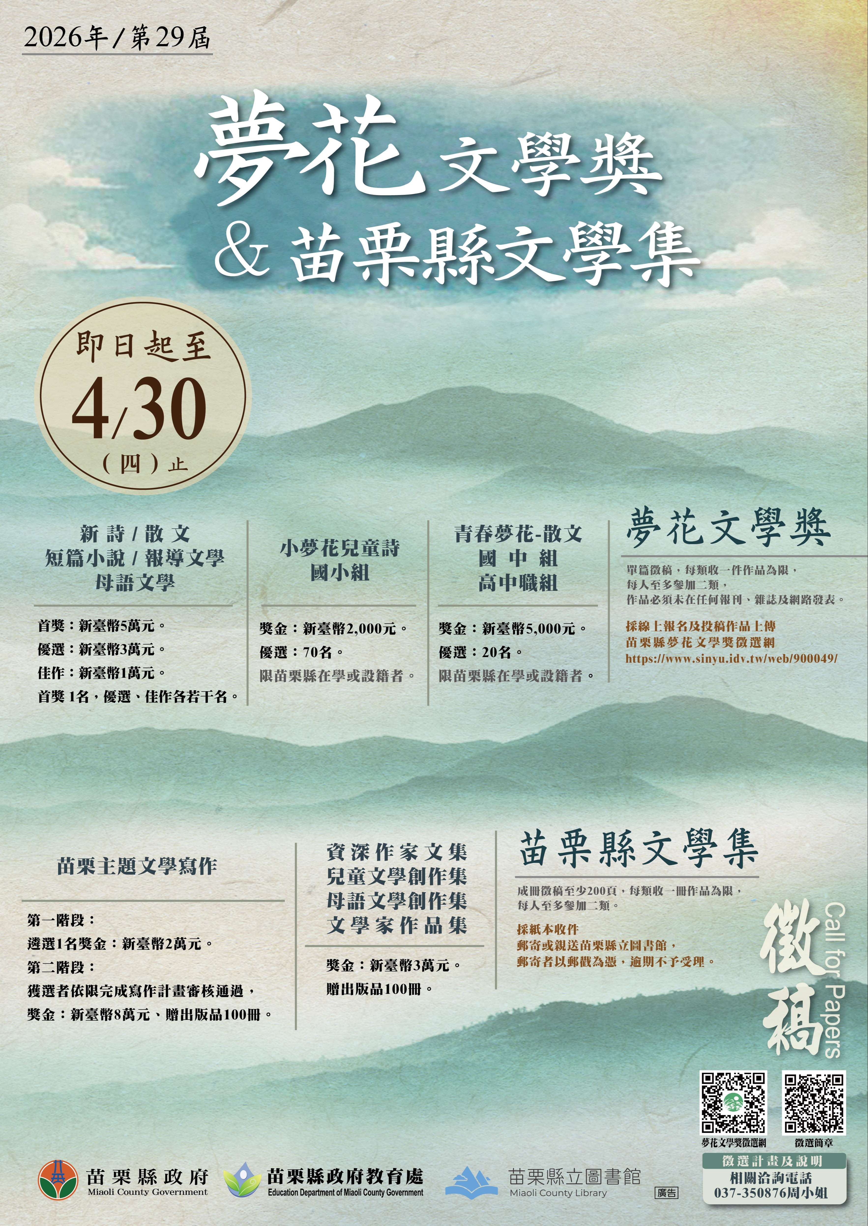 三、第29屆夢花文學獎暨苗栗縣文學集徵選,收件時間自即日起至115年4月30日止。