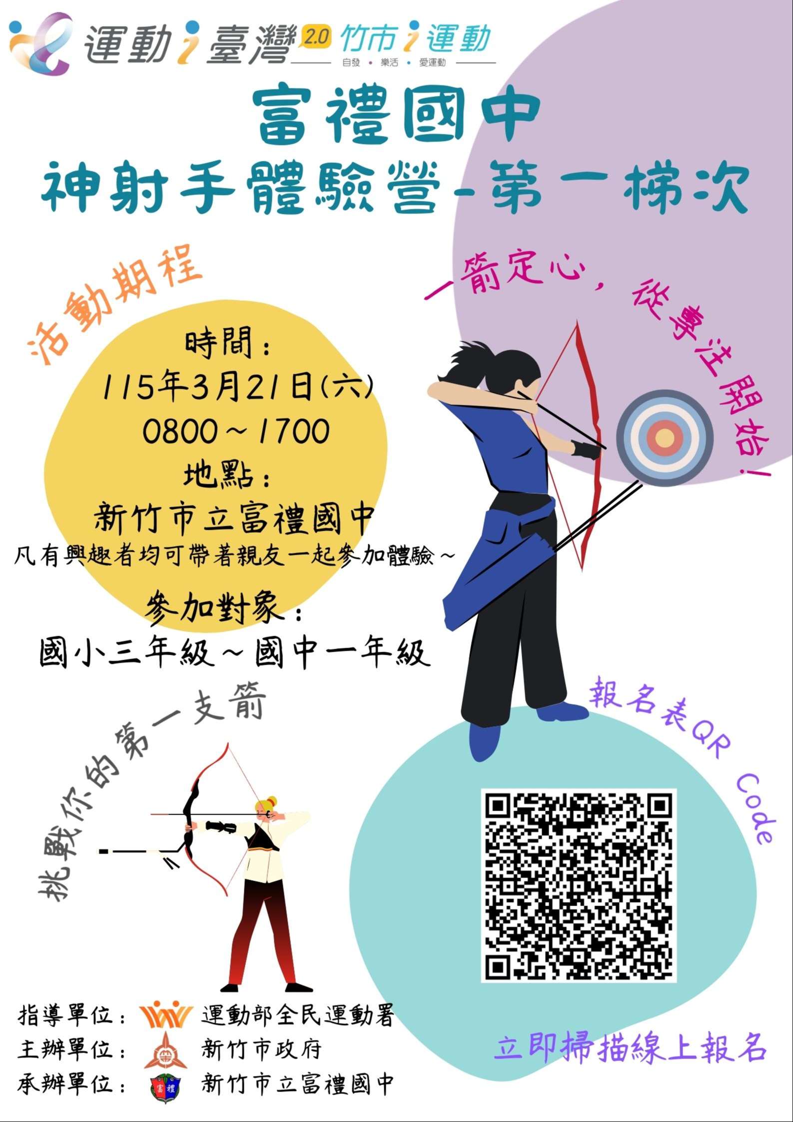 一、 富禮國中為推廣射箭運動及強化學生專注力與運動素養,結合運動i臺灣計畫,特舉辦國小、國中學生射箭體驗活動,詳細活動資訊如下: